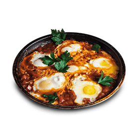 Sauté épicé, oeufs pochés, tomates, poivrons, ail, cumin.